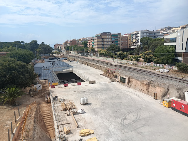 Des de la rampa que puja i des del pas sobre les vies vaig fer aquestes fotografies. La informació sobre el que s'està fent en aquest indret l'acabo d'explicar al punt anterior. Començo amb una perspectiva que mostra els dos túnels del carrer Montserrat amb la llosa de cobertura de la futura estació: